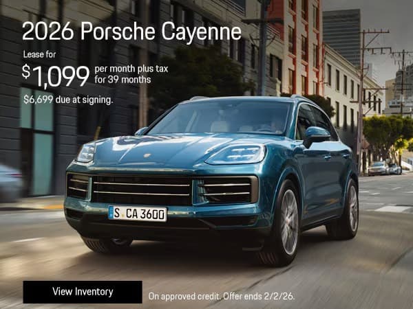 1 at this offer. Stock: P26A00091. New 2026 Porsche Cayenne. 39 month lease payments of $1,099 plus tax. Amount due at signing, $6,699 customer cash. No security deposit required. Based on 10,000 miles per year, excess miles charged at $.30 cents per mile. On approved credit. Plus government fees and taxes, any finance charges, $85 dealer document processing charge, any electronic filing charge and any emission testing charge. Offer expires 2/2/26.