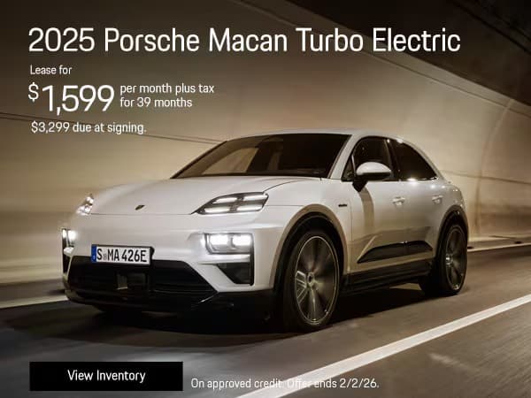 1 at this offer. Stock:P25176120. New 2025 Porsche Macan Turbo Electric. 39 month lease payments of $1,599 plus tax. Amount due at signing, $3,299 customer cash. No security deposit required. Based on 10,000 miles per year, excess miles charged at $.30 cents per mile. On approved credit. Plus government fees and taxes, any finance charges, $85 dealer document processing charge, any electronic filing charge and any emission testing charge. Offer expires 2/2/26.