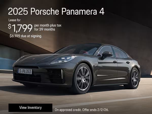 1 at this offer. Stock: P25001236P. New 2025 Porsche Panamera 4. 39 month lease payments of $1,799 plus tax. Amount due at signing, $6,199 customer cash. No security deposit required. Based on 10,000 miles per year, excess miles charged at $.30 cents per mile. On approved credit. Plus government fees and taxes, any finance charges, $85 dealer document processing charge, any electronic filing charge and any emission testing charge. Offer expires 2/2/26.