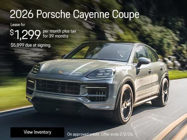 1 at this offer. Stock: P26A36902. New 2026 Cayenne Coupe. 39 month lease payments of $1,299 plus tax. Amount due at signing, $5,899 customer cash. No security deposit required. Based on 10,000 miles per year, excess miles charged at $.30 cents per mile. On approved credit. Plus government fees and taxes, any finance charges, $85 dealer document processing charge, any electronic filing charge and any emission testing charge. Offer expires 2/2/26.