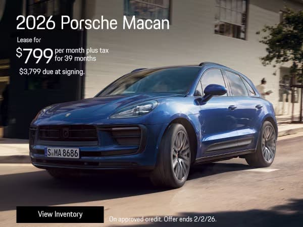 1 at this offer. Stock:P26B02495. New 2026 Porsche Macan. 39 month lease payments of $799 plus tax. Amount due at signing, $3,799 customer cash. No security deposit required. Based on 10,000 miles per year, excess miles charged at $.30 cents per mile. On approved credit. Plus government fees and taxes, any finance charges, $85 dealer document processing charge, any electronic filing charge and any emission testing charge. Offer expires 2/2/26.