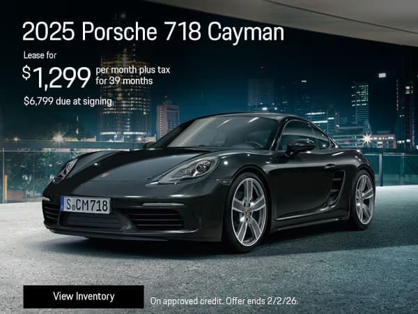1 at this offer. Stock:P25256286. New 2025 Porsche 718 Cayman. 39 month lease payments of $1,299 plus tax. Amount due at signing, $6,799 customer cash. No security deposit required. Based on 5,000 miles per year, excess miles charged at $.30 cents per mile. On approved credit. Plus government fees and taxes, any finance charges, $85 dealer document processing charge, any electronic filing charge and any emission testing charge. Offer expires 2/2/26.