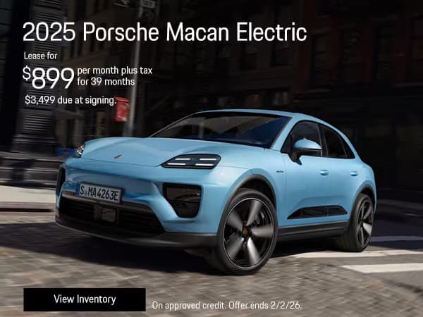 1 at this offer. Stock:P25076532P. New 2025 Porsche Macan Electric. 39 month lease payments of $899 plus tax. Amount due at signing, $3,499 customer cash. No security deposit required. Based on 10,000 miles per year, excess miles charged at $.30 cents per mile. On approved credit. Plus government fees and taxes, any finance charges, $85 dealer document processing charge, any electronic filing charge and any emission testing charge. Offer expires 2/2/26.