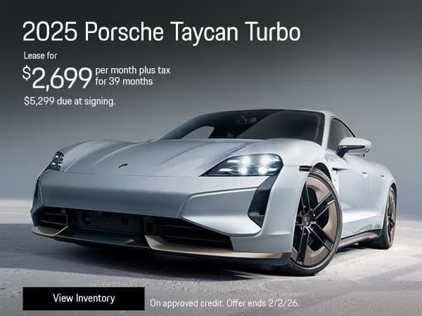 1 at this offer. Stock: P25A55575. New 2025 Porsche Taycan Turbo. 39 month lease payments of $2,699 plus tax. Amount due at signing, $5,299 customer cash. No security deposit required. Based on 10,000 miles per year, excess miles charged at $.30 cents per mile. On approved credit. Plus government fees and taxes, any finance charges, $85 dealer document processing charge, any electronic filing charge and any emission testing charge. Offer expires 2/2/26.